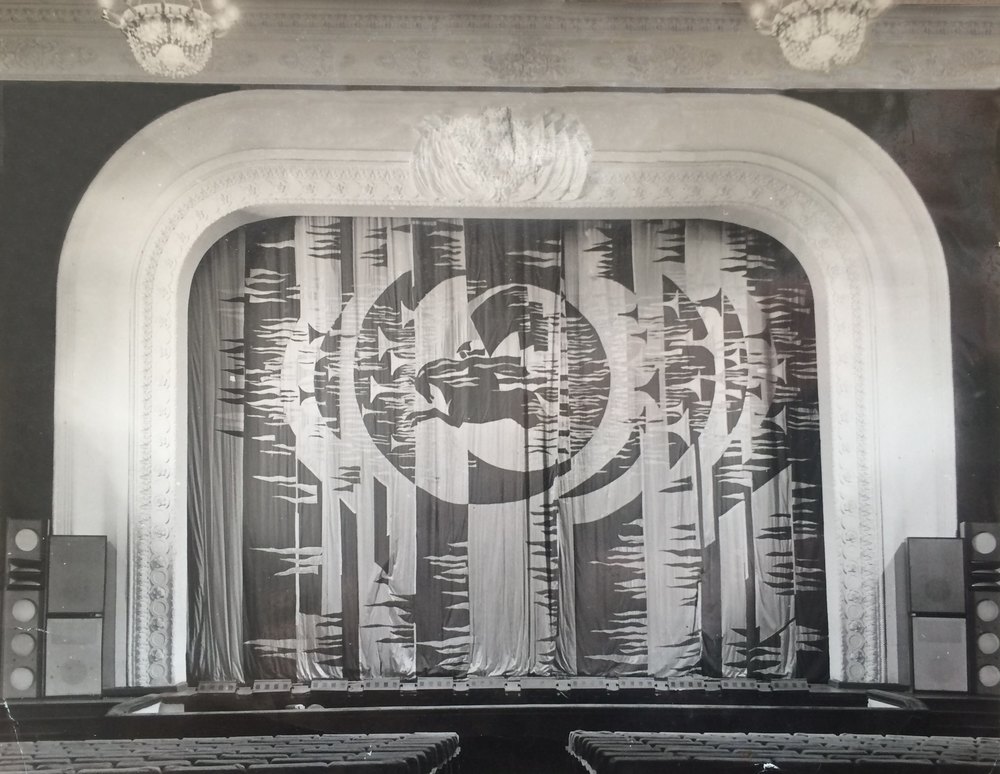 Мы восстановили все лепные элементы и архитектурные детали в интерьерах Дворца. Отреставрировали бронзовые люстры и другие бронзовые светильники, канделябры, восстановив в них хрустальные подвесы. И главное, мы исполнили по нашему эскизу основной декоративный элемент зала — распашной занавес на сцене в уже знакомой нам по Дворцу пионеров технике «аппликация по ткани». По алому и тёмно-малиновому фону в вихре революции мчатся всадники в будёновках и трубят в трубы. Так мы отразили тему взятия Красной армией Перекопа (см. фото).