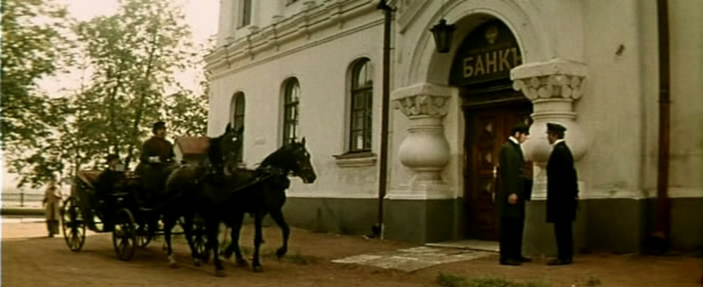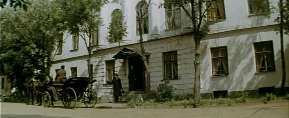 Княжна Марья, направляясь к Топоркову, проходит вдоль ограды Знаменской церкви и возле главного корпуса педуниверситета, где перед революцией располагалось Ионафановское училище. Банк, где Топорков хранит свои капиталы, располагается в здании глазной лечебницы Кацаурова: соответствующая вывеска размещена над подъездом с пузатыми колоннами.